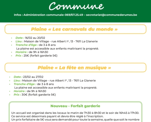 Lien pour l'inscription aux plaines de jeux communales du congé de détente 2026 : https://emma.one.be/#/atl/inscription?poDenomination=Commune