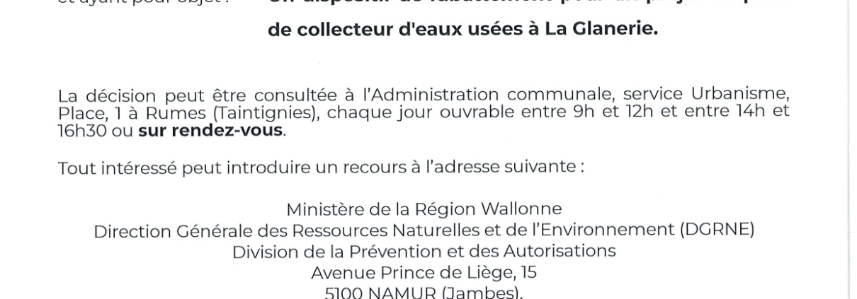 Le Bourgmestre informe la population q’un permis d’environnement a été délivré à l’intercommunale IPALLE et ayant pour objet Un dispositif de rabattement pour un projet de pose de collecteur d’eaux usées à La Glanerie.