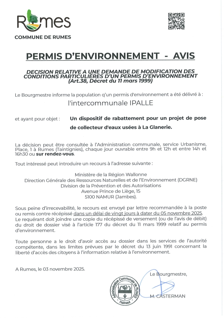 Le Bourgmestre informe la population q’un permis d’environnement a été délivré à l’intercommunale IPALLE et ayant pour objet Un dispositif de rabattement pour un projet de pose de collecteur d’eaux usées à La Glanerie.